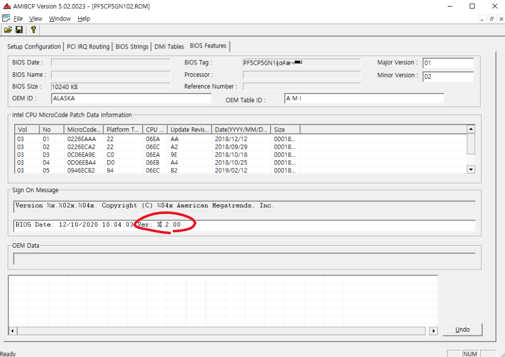 3. (선택) DMI테이블과 BIOS Features 탭에서 새로 플래싱된 바이오스를 기존바이오스와 구별하기위해서 버전을 바꿔줍니다.