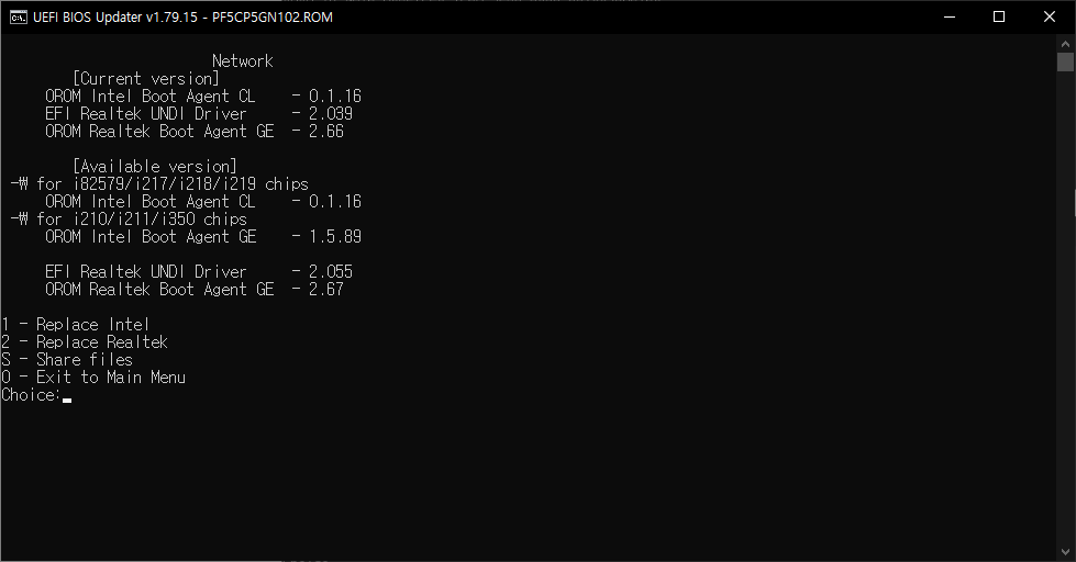 5.2 3을 입력하여 네트워크 메뉴로 진입합니다. OROM Intel Boot Agent CL버전이 0.1.14에서 0.1.16으로 업데이트가 가능하네요