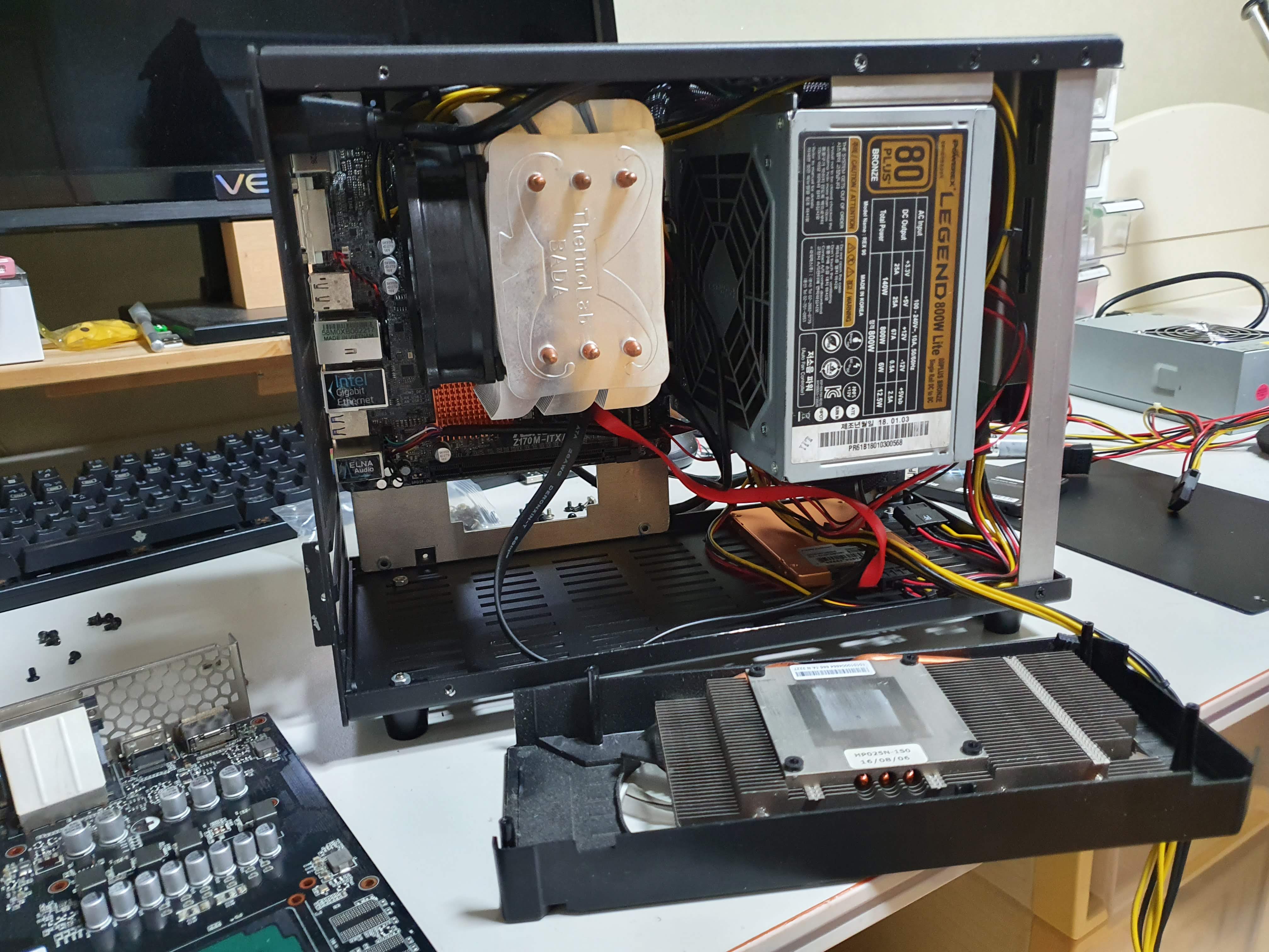 ITX ๋ฉ์ธ๋ณด๋๊ฐ ์์ชฝ์ ๋ณด์ด๊ณ CPU์ฟจ๋ฌ์ ํ์๊ฐ ๋ณด์ด๋ค์. ์๋์ชฝ์ ๊ทธ๋ํฝ์นด๋๊ฐ ์๊ณ ์ค๋ฅธ์ชฝ์๋ ํ๋๊ฐ ์์ด์. ์กฐ๊ทธ๋ง ๊ณต๊ฐ์ ์์๊ฑด ๋ค ์๋ค์.