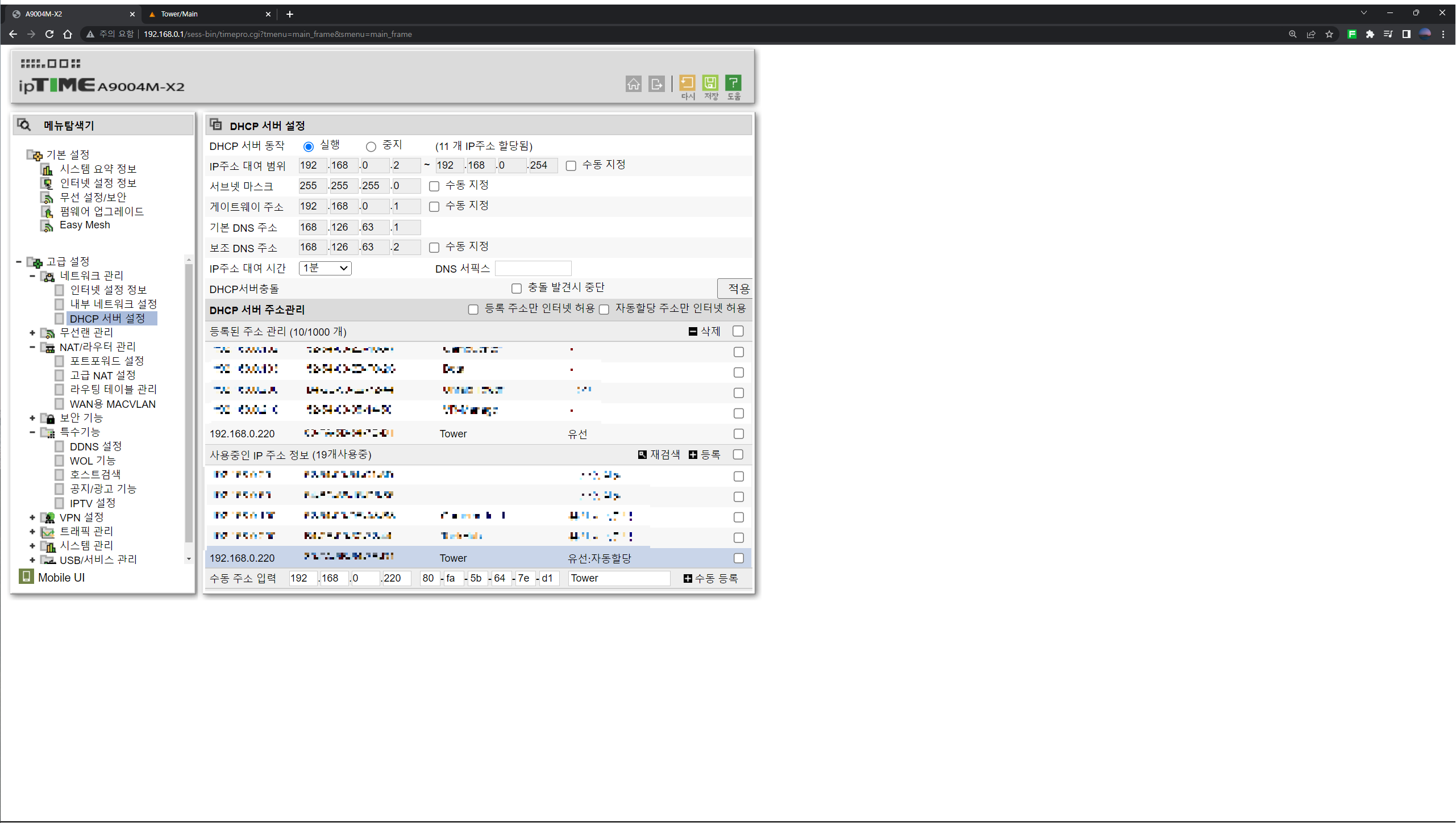๊ณ ๊ธ์ค์ -๋คํธ์ํฌ๊ด๋ฆฌ-DHCP์๋ฒ ์ค์ ์์ ip๋ฅผ ์ง์ ํด ์ค ์ ์๋ค. (๊ด๋ฆฌํ์ด์ง ์ ์๋ฐฉ๋ฒ์ ๋ค๋ฅธ๊ธ ์ฐธ๊ณ .)