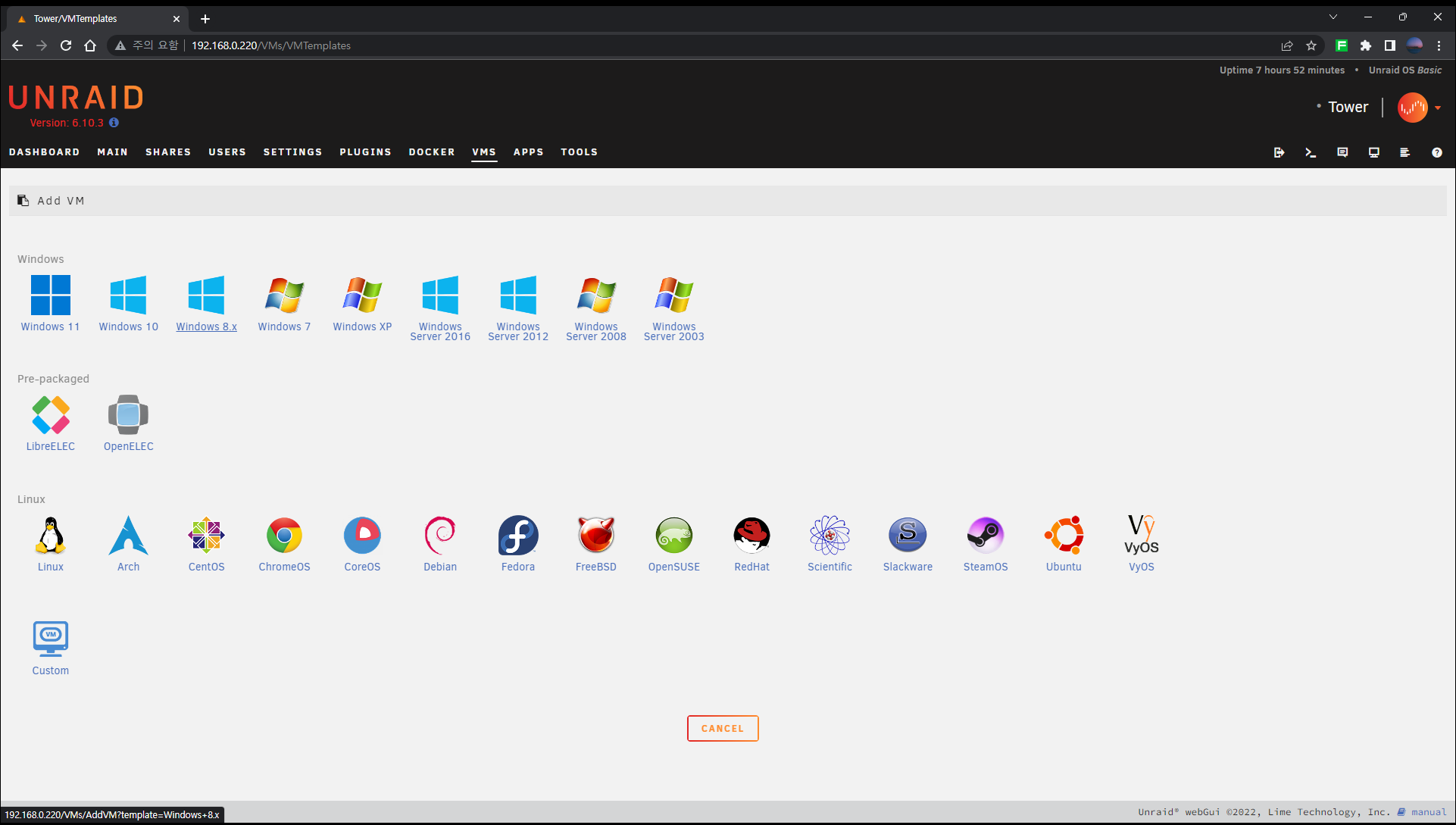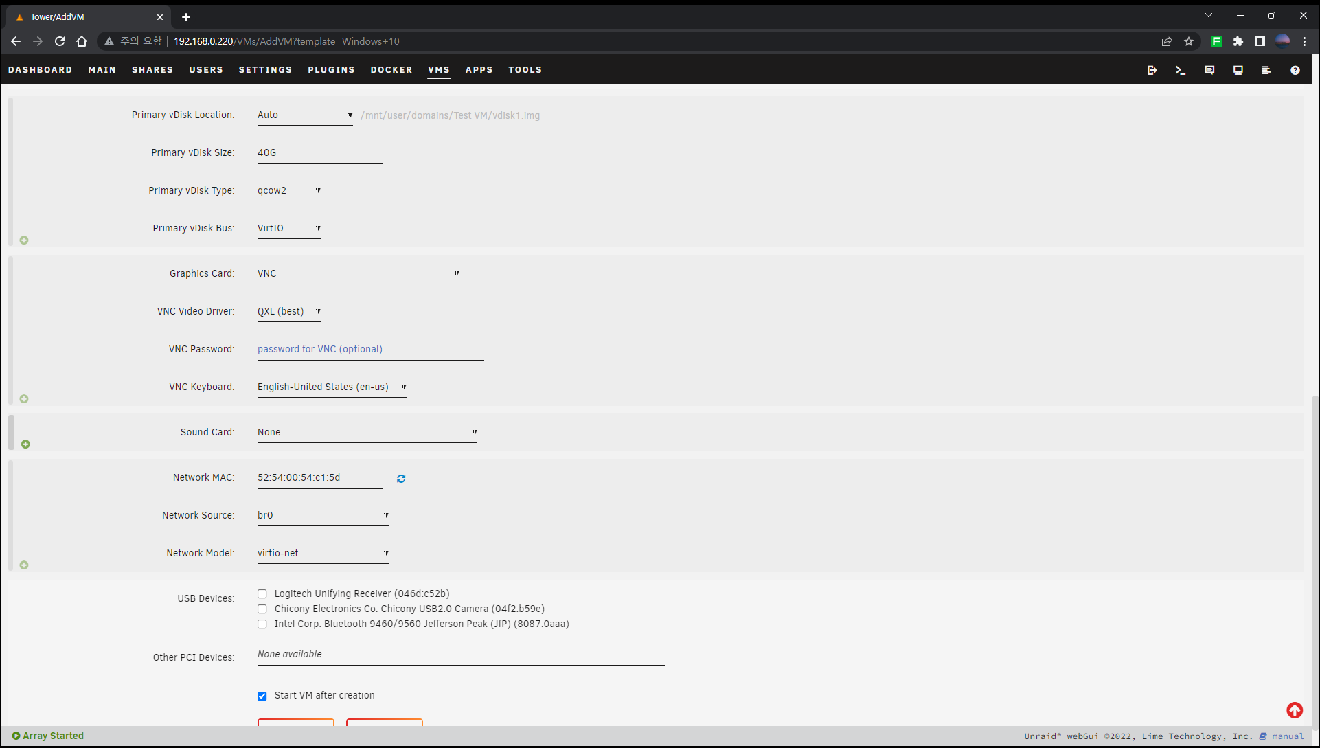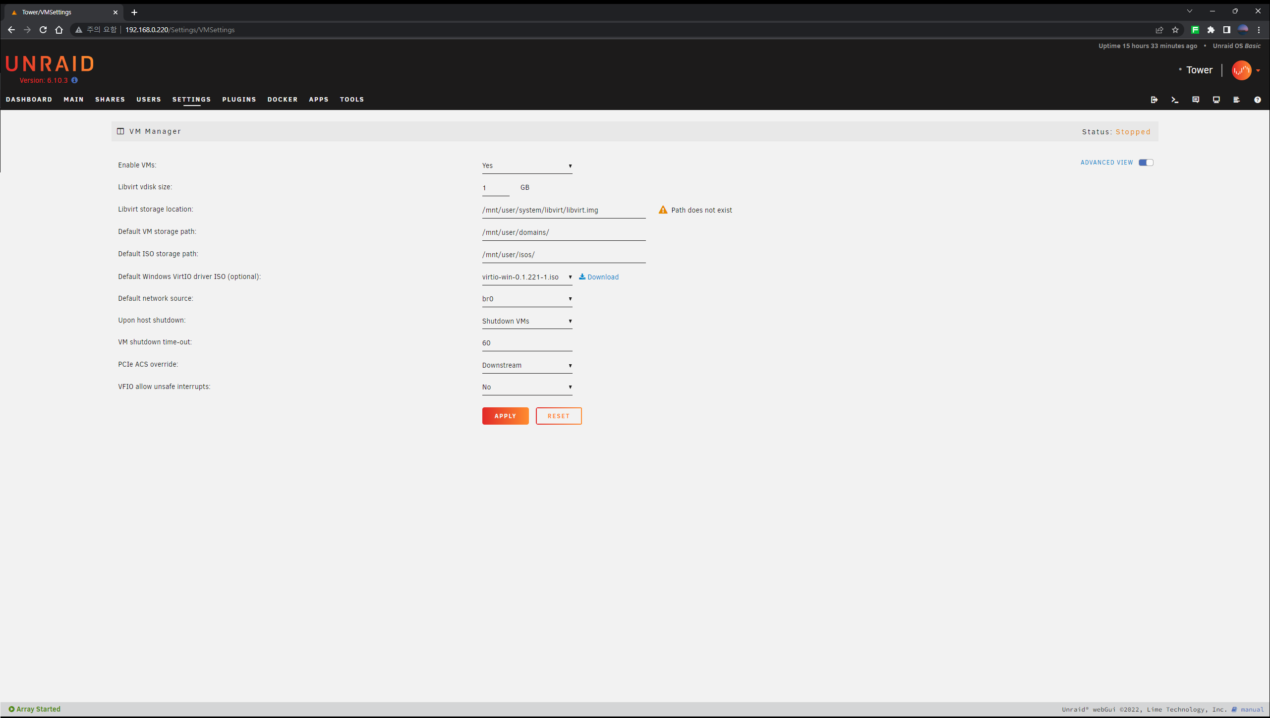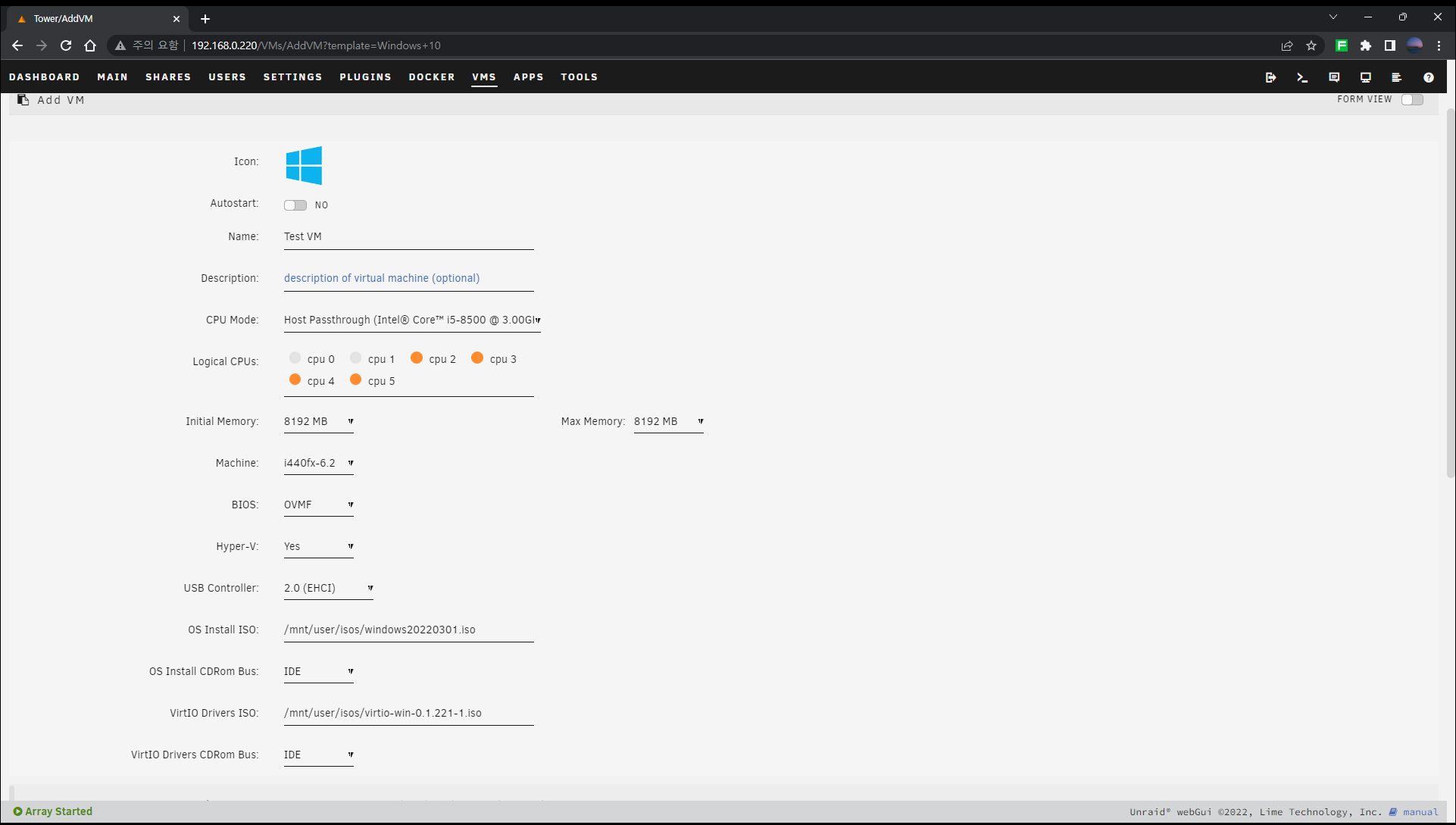 - Default VM Storage Path์ Default ISO Storage Path๊ฐ ๊ฐ๊ฐ /mnt/user/domains/์ /mnt/user/isos๋ก ์ค์ ๋์ด ์๋์ง ํ์ธํ๋ค. ๋ง์ฝ ์์ด๋ฅผ ์ถ๊ฐํ ๋ ๋ค๋ฅธ ์ด๋ฆ์ผ๋ก ํ๋ค๋ฉด ํด๋น ๊ฒฝ๋ก๋ฅผ ๋ฐ๋ผ๊ฐ๋ค.