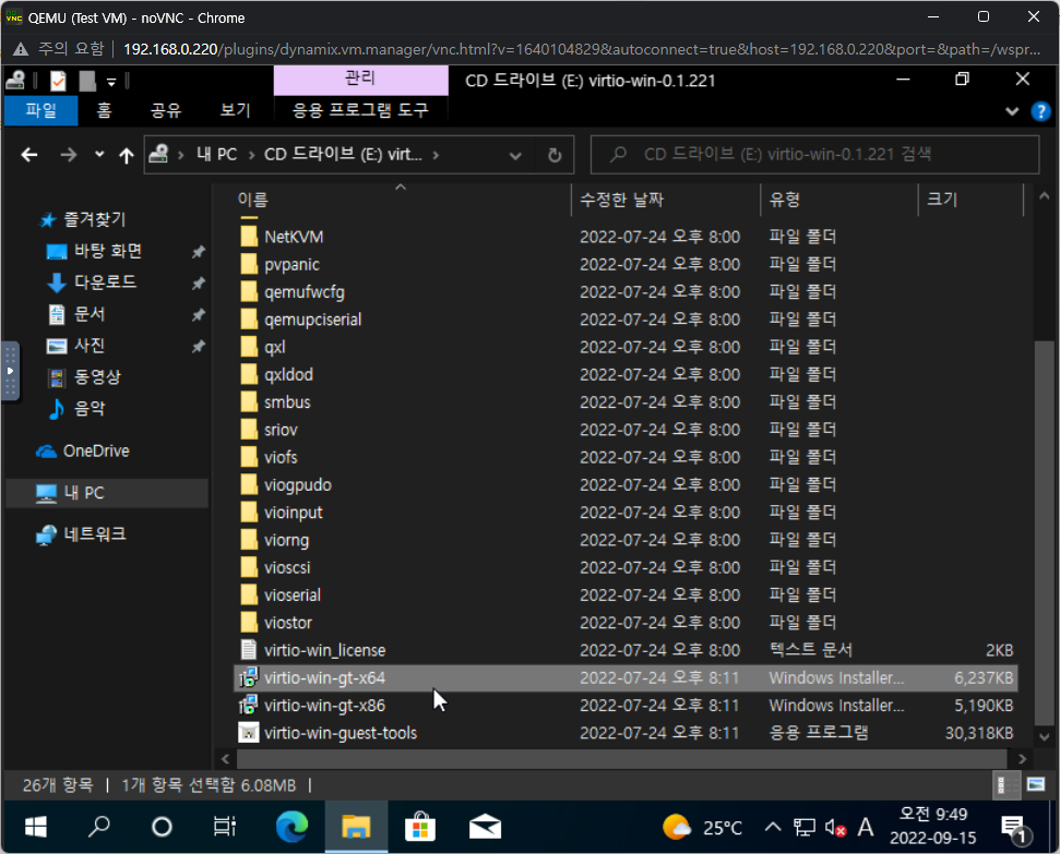 ๋์คํฌ ๋ด์ virtio-win-gt๋ฅผ ์คํํด ๋๋ผ์ด๋ฒ๋ฅผ ์ค์นํ๋ค. ์ค์น๊ฐ ์๋ฃ๋๋ฉด virtio-win-guest-tool๋ ์คํํด ์ค์นํด์ค๋ค.