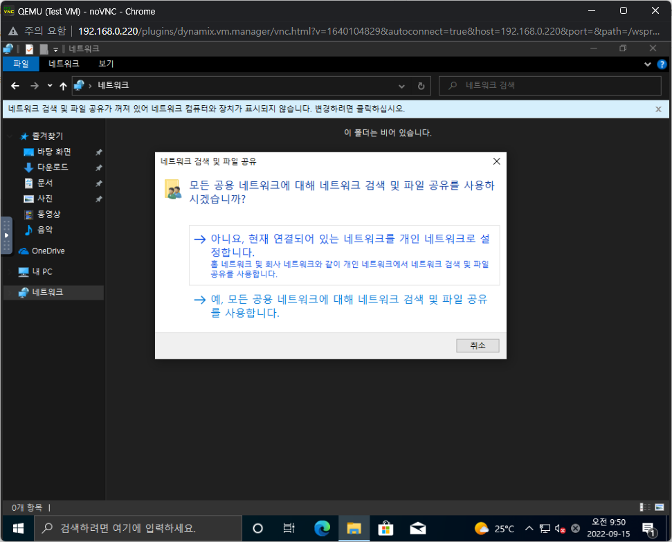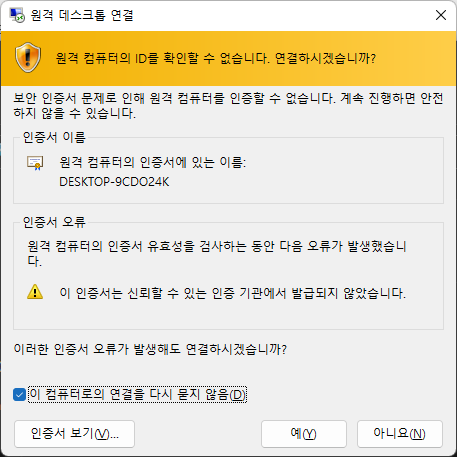 ์๋ ํ์ผํ์๊ธฐ์์๋ DESKTOP-xxxx์ ์ด๋ฆ์ผ๋ก ๋ํ๋๋ค. ๋ฐ์คํฌํ์ ์ฐํด๋ฆญํ์ฌ ์๊ฒฉ ๋ฐ์คํฌํฑ ์ฐ๊ฒฐ์ ์งํ ํ ์ ์๋ค. ์ค์ ํ ์๋์ฐ ๊ณ์ ์ ID์ ๋น๋ฐ๋ฒํธ๋ฅผ ์ ๋ ฅํ๋ฉด ์ค๋ฅธ์ชฝ๊ณผ ๊ฐ์ด ์ธ์ฆ์ ๊ฒฝ๊ณ ๊ฐ ๋์ค๋๋ฐ, ๋ค์ ๋ฌป์ง ์์์ ์ ํํ๊ณ ํ์ธ์ ๋๋ฌ์ฃผ๋ฉด ์์ฑํ VM์ ์๊ฒฉ์ ์์ด ๊ฐ๋ฅํด์ง๋ค.