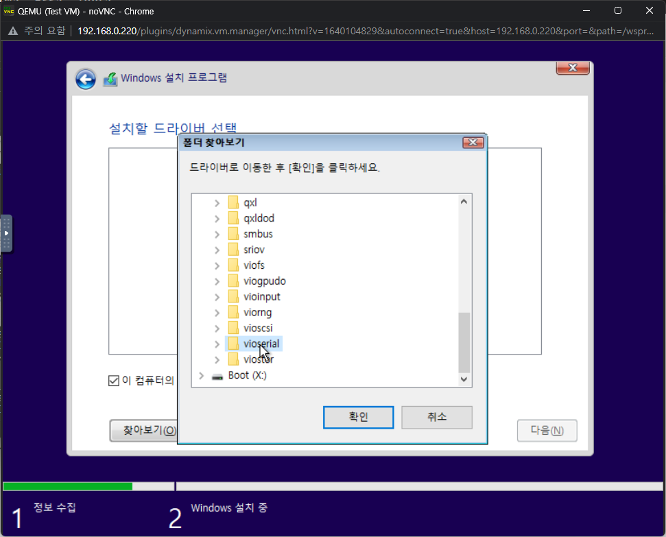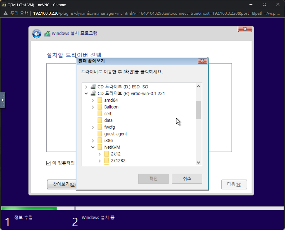- ๋๋ผ์ด๋ฒ ๋ก๋ - ์ฐพ์๋ณด๊ธฐ - NetKVM - w10 - amd64๋ฅผ ์ ํํ๋ค.