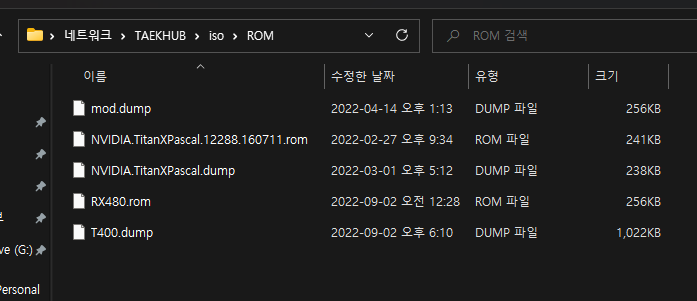 ํ์๋ NVIDIA.TitanXPascal.dump๋ผ๋ ํ์ผ๋ก ์ ์ฅํ๋ค. ๋ณธ์ธ์ด ๊ธฐ์ตํ ์๋ง ์๋ค๋ฉด ์ด๋ฆ์ ์๋ฌด๋๋ ์๊ด์๋ค. ์ด๋ ๊ฒ ์ ์ฅํ ํ์ผ์ SMB๋ฅผ ํตํด ์๋ฒ์ isoํด๋ ์์ ๋ฃ์ด์ค๋ค. ROM ํด๋ ์์ ์๋ ์ด์ ๋ isosํด๋ ์์ virtIO๋๋ผ์ด๋ฒ๋ฅผ ์ํ VirtIO, GPU๋ฐ์ด์ค์ค๋ฅผ ์ํ ROM, ์๋์ฐ ISO๋ค์ ์ํ Windwos๋ฑ์ผ๋ก ํ์ ํด๋๋ฅผ ๋์ด ๊ตฌ๋ถํ๊ธฐ ๋๋ฌธ์ด๋ค.