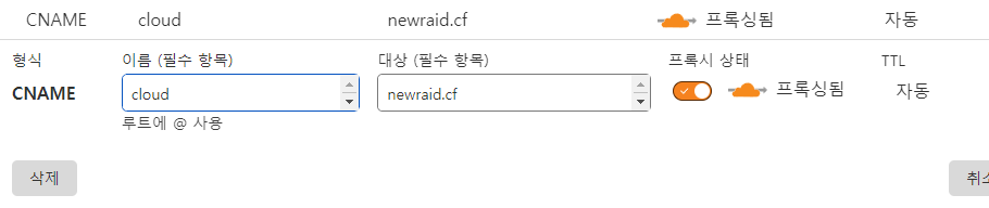 ํด๋ผ์ฐ๋ํ๋ ์ด์์ nextcloud๊ฐ ์ฌ์ฉํ ์๋ธ๋๋ฉ์ธ์ ์๋ก ๋ง๋ค์ด์ค๋ค. CNAME์ธ๊ฒ์ ๊ฐ์ง๋ง ์ผ์ชฝ์นธ์ ์๋ธ๋๋ฉ์ธ์ ์ ๋ ฅํ๊ณ ์ฐ์ธก์ ์๋ ๋๋ฉ์ธ(ํน์ @)๋ฅผ ์ ๋ ฅํ๋ค.