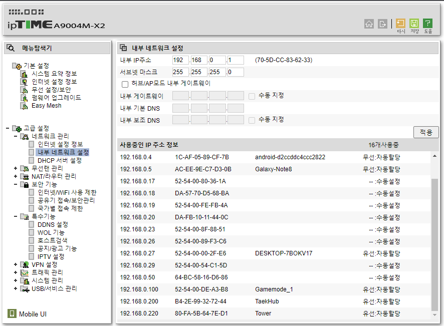 ๊ณต์ ๊ธฐ์ [๊ณ ๊ธ์ค์ - ๋คํธ์ํฌ ๊ด๋ฆฌ - ๋ด๋ถ ๋ดํธ์ํฌ ์ค์ ]์ ๋ค์ด๊ฐ ์๋ฒ์ MAC์ฃผ์๋ฅผ ๊ธฐ์ตํ๋ค.