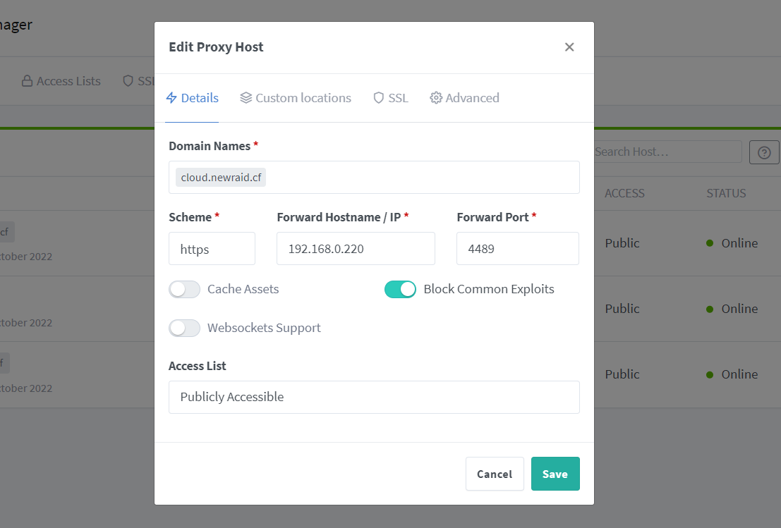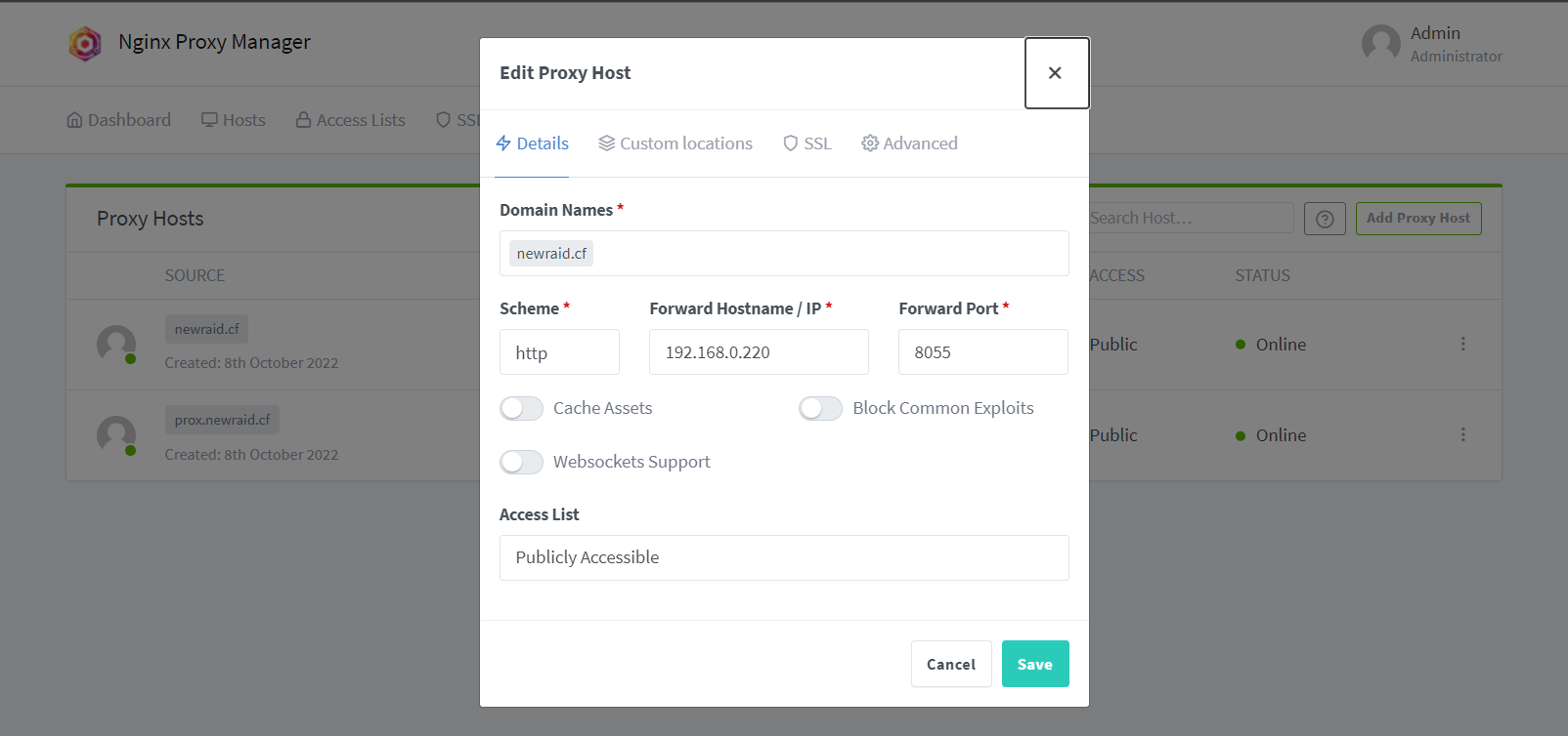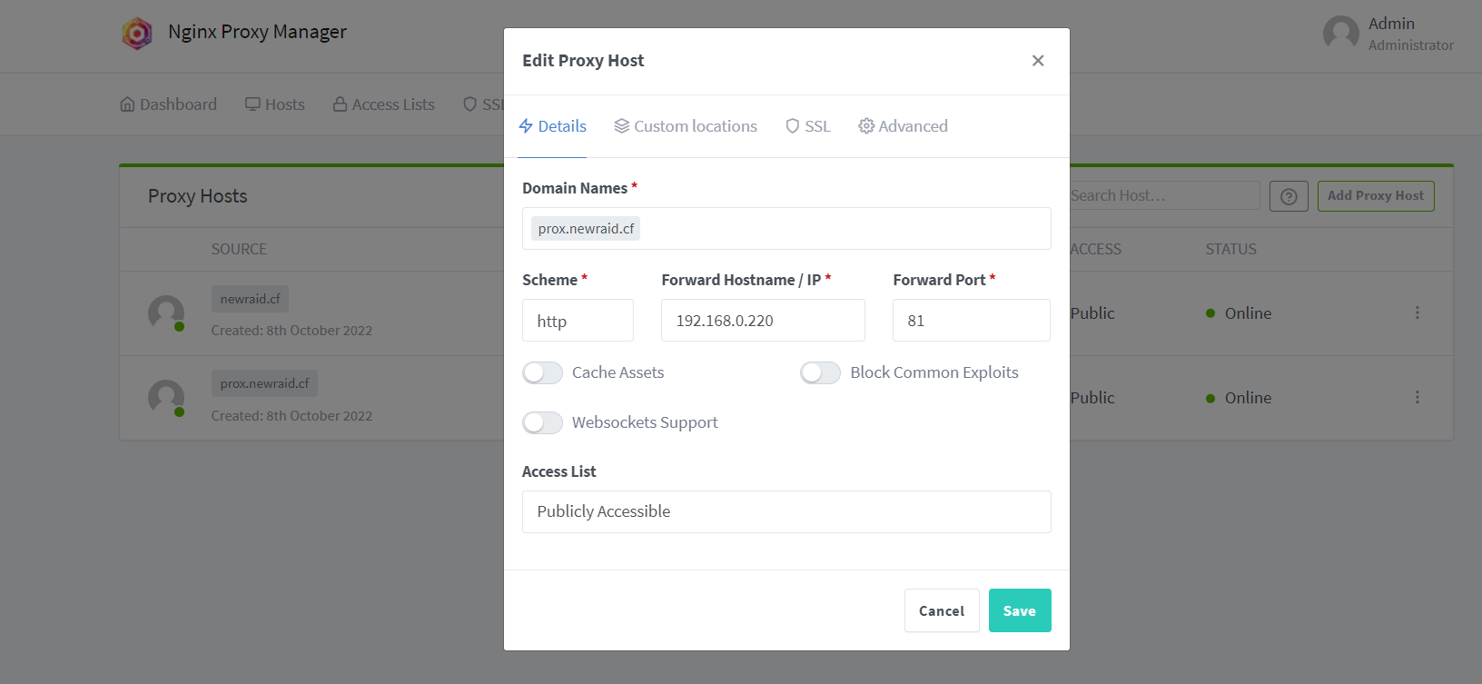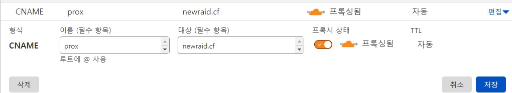 ๋๋ฉ์ธ ์ด๋ฆ์ ์๋ธ๋๋ฉ์ธ๊น์ง ํฌํจ๋ prox.newraid.cf๋ก ์ค์ ํ๊ณ ์์ดํผ๋ ๋์ผ, ํฌํธ๋ฅผ 81๋ฒ ํฌํธ๋ก ์ง์ ํ๋ค.