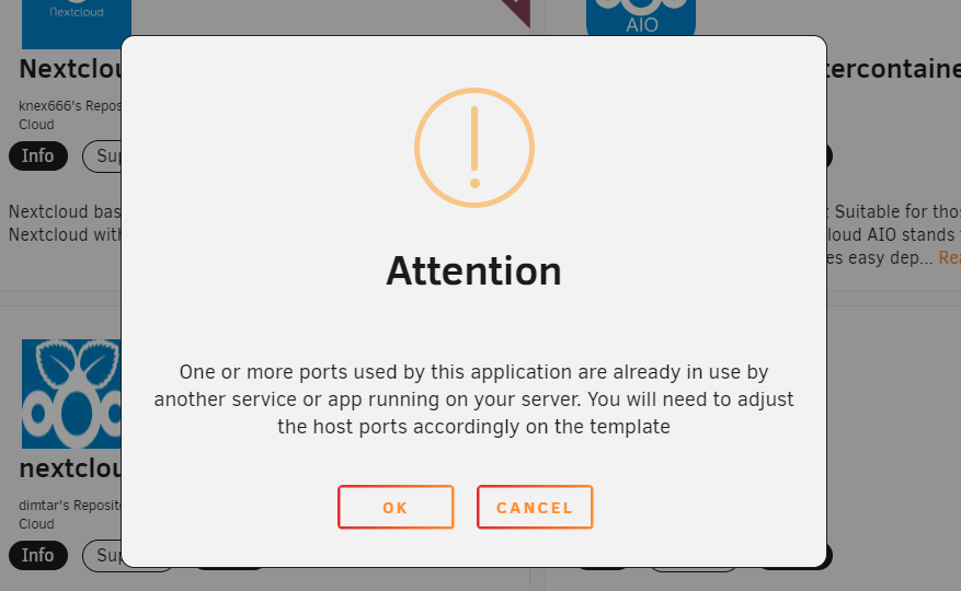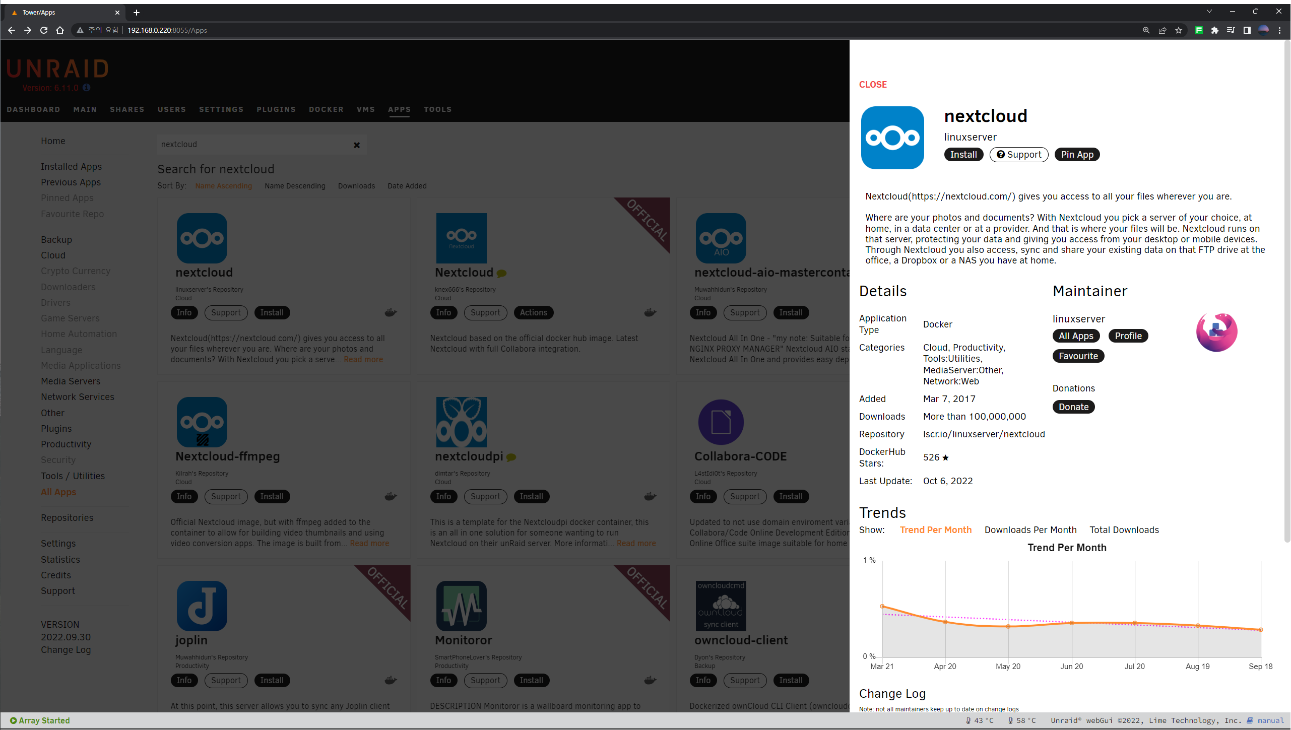 ๋น์ฐํ APPSํญ์์ nextcloud๋ฅผ ๊ฒ์ํด ์ปจํ ์ด๋๋ฅผ ์ค์นํ๋ค.