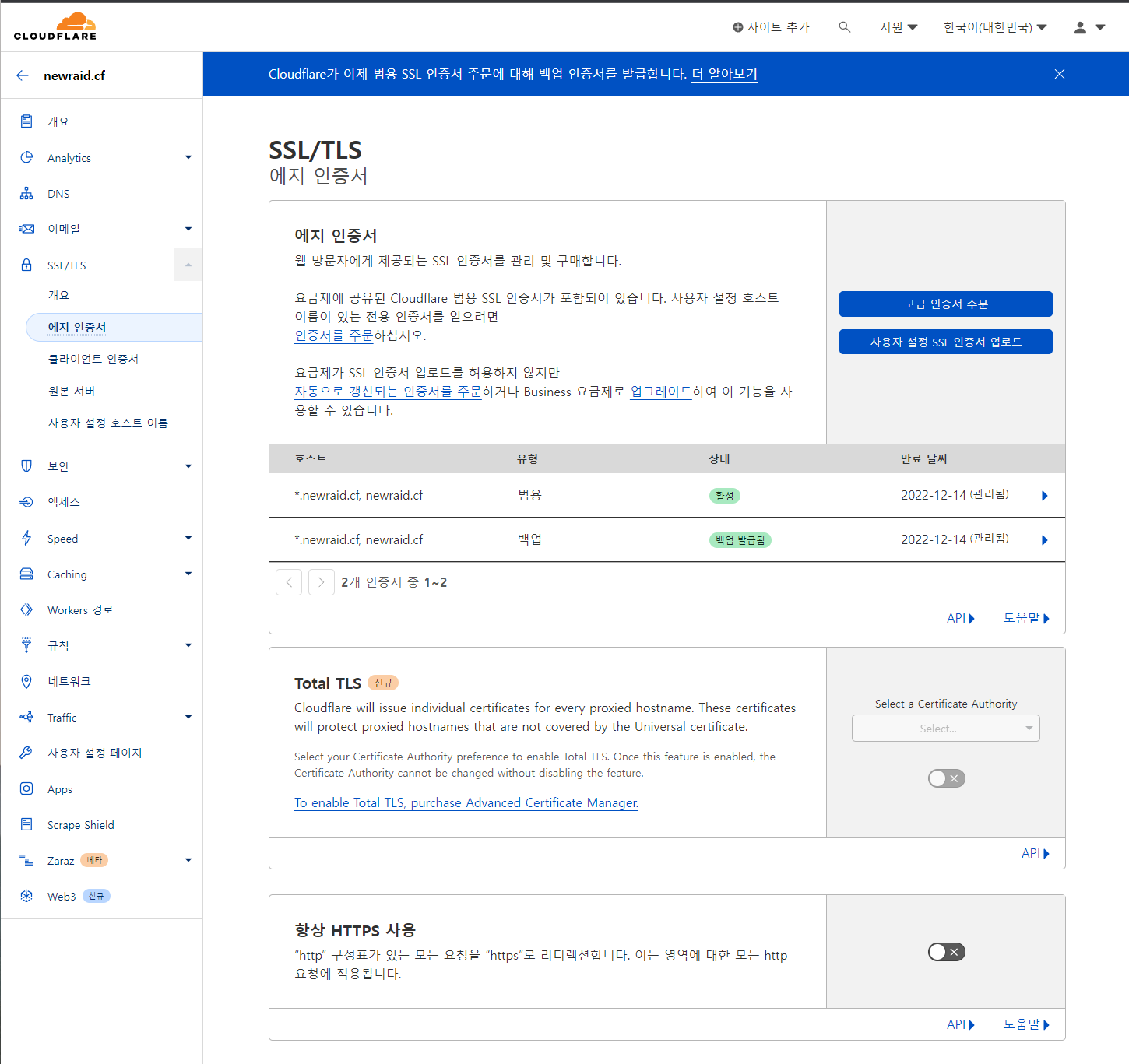SSLํญ์์ ์๋ก์ด SSL์ ์์ฒญํ๊ณ Force SSL๊ณผ HSTS์ต์ ์ ํ์ฑํ ํ๋ค. ์ฒ์ SSL์ธ์ฆ์๋ฅผ ๋ฐ๊ธ๋ฐ๊ธฐ ์ํด์๋ ์ด์ฉ์ฝ๊ด ๋์๊ฐ ํ์ํ๋ค.