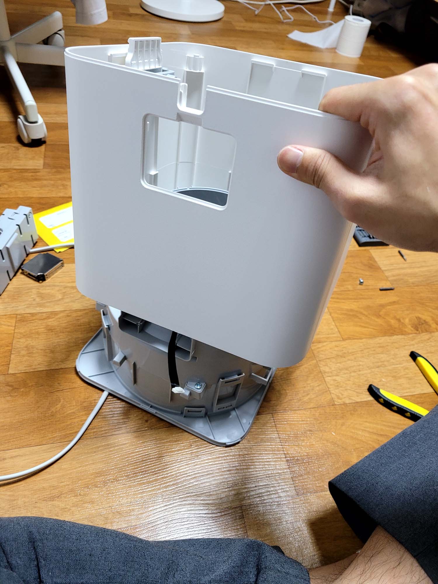미래의 내가 깨닫은 결과 해법은 위가 아닌 밑에 있었다. 본체 하우징의 양 쪽 끝단을 잡고 팬을 포함한 본체 부분을 발로 찼다. 마치 친구에게 오토바이 장난을 치듯이 발로 찼다. 그럴 수 밖에 없는것이, 안전망 역할을 하는 덮개 부분이 흰색 하우징 부품과 8개의 포인트에서 구조적 물림으로 결합되어있어 웬만해선 빠지지 않는다. 독자분은 다른 방식을 찾았다면 안전하고 품격있는 방법으로 해결하길 바란다.