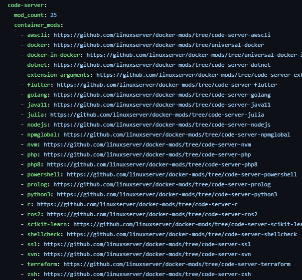 linuxserver/mods:code-server-python3|linuxserver/mods:code-server-java11|linuxserver/mods:code-server-flutter|linuxserver/mods:code-server-nodejs|linuxserver/mods:universal-git|linuxserver/mods:universal-docker-in-docker