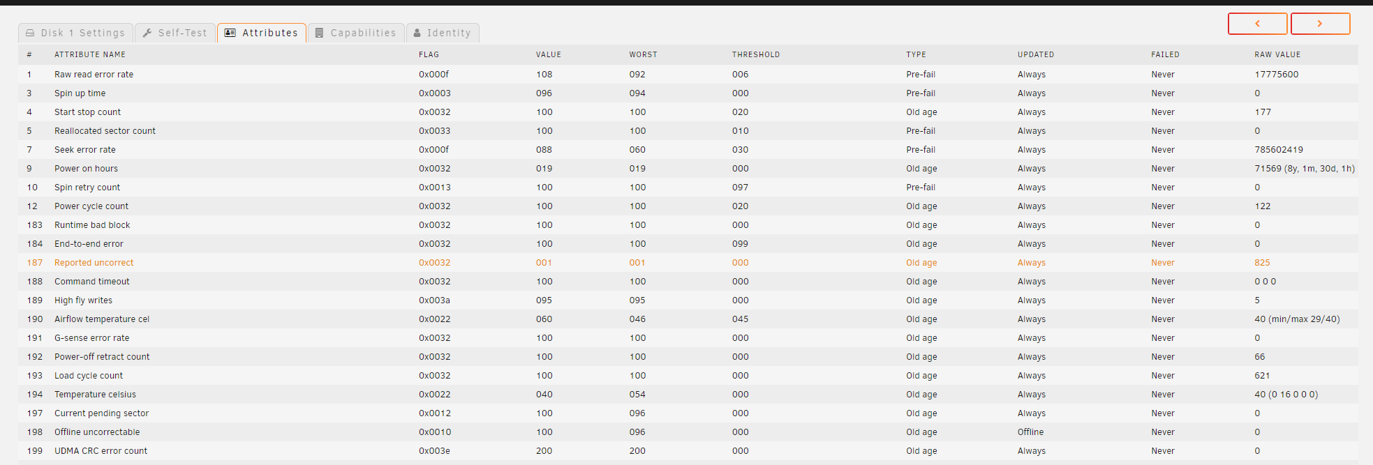 Attibutes탭으로 이동하면 해당 디스크의 SMART정보를 볼 수 있다.