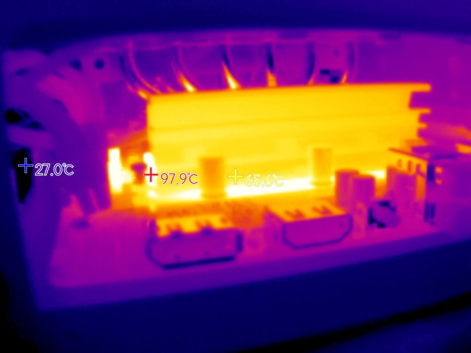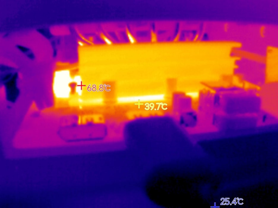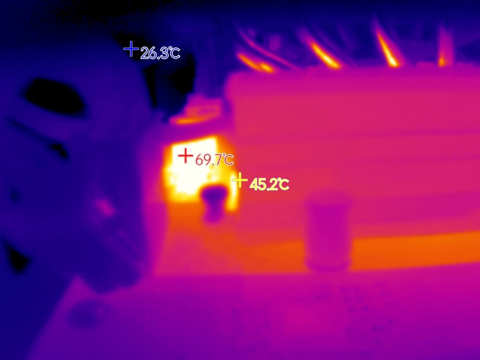 ํ’€๋กœ๋“œ๋ฅผ 10๋ถ„๊ฐ„ ์œ ์ง€ํ•œ ์ƒํƒœ์—์„œ์˜ ์ „์›๋ถ€ ์˜จ๋„์ด๋‹ค. ํžˆํŠธ์‹ฑํฌ๊ฐ€ 60๋„ ๋‚ด์ง€ 70๋„ ์ •๋„๋กœ ์ƒ์Šนํ–ˆ๊ณ , ์ดˆํฌ์˜ ์˜จ๋„๋„ 90~100๋„๋กœ ์˜ฌ๋ผ๊ฐ„๋‹ค. Vcore๋ถ€๋ถ„์˜ ์ดˆํฌ์˜จ๋„๋Š” ํ™•์ธ์„ ๋ชปํ–ˆ์ง€๋งŒ ํžˆํŠธ์‹ฑํฌ์˜ ์˜จ๋„๊ฐ€ ์ตœ๋Œ€ 70๋„ ์„ ์ธ๊ฒƒ์„ ๋ณด๋‹ˆ 165W๋ฅผ ์ง€์†์ ์œผ๋กœ ์œ ์ง€ํ•  ์ˆ˜ ์žˆ๋Š”๊ฒƒ์œผ๋กœ ๋ณด์ธ๋‹ค.