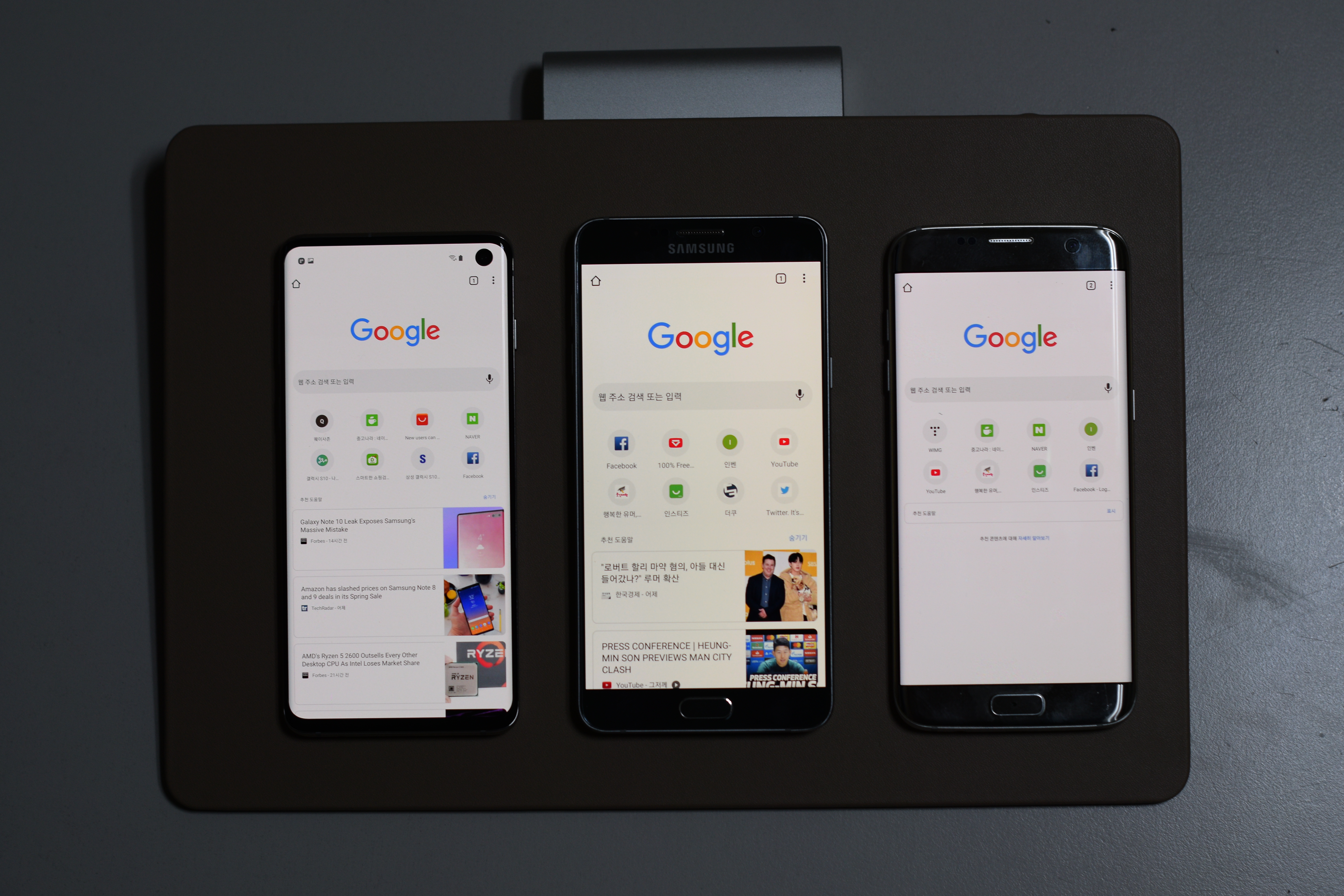 ์ผ์ชฝ๋ถํฐ S10, ๋ ธํธ5, S7 edge์ ๋๋ค. ํ์คํ ๋ฒ ์ ค์ด ๋ง์ด ์ค์ด๋ ๋๋ถ์ ํฌ๊ธฐ๋ ๋ ธํธ5๋ณด๋ค ์์ผ๋ฉด์ ํ๋ฉด ๋ฉด์ ์ด ๋ ๋์๊ฑธ ํ์ธํ ์ ์์ต๋๋ค. ๋ค๋ง ์ํํธํค ์ฌ์ฉ ์์๋ ๊ฐ์ฉ ํ๋ฉด์ด ๋ ์ค์ด๋๋ ์ ์ฐธ๊ณ ํ์ธ์.